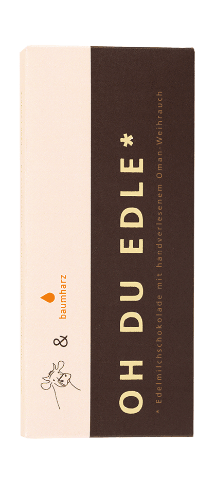 Milchschokolade (Kakao: 48% mindestens) mit handverlesenem Weihrauch aus dem Oman.