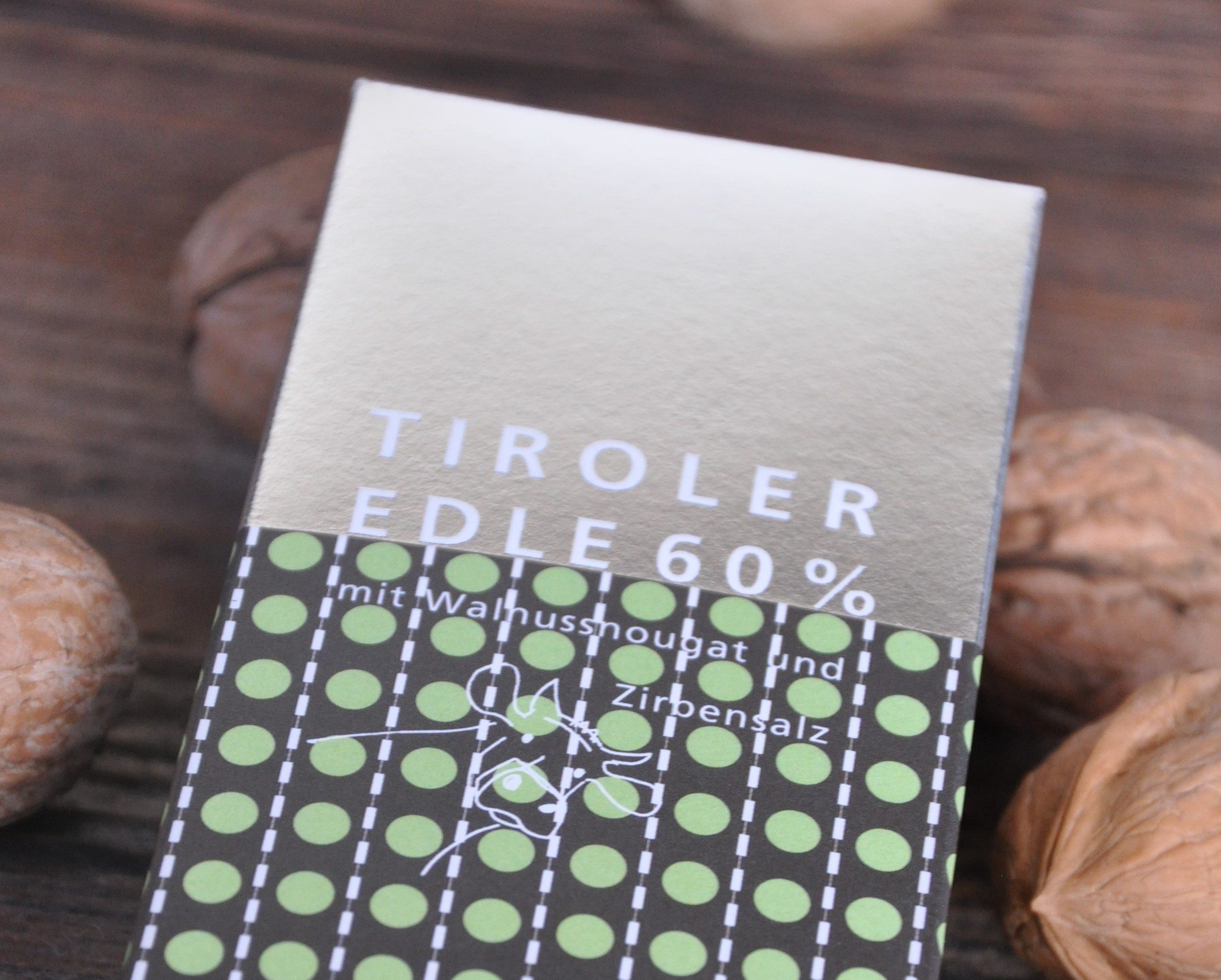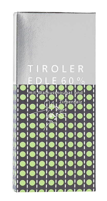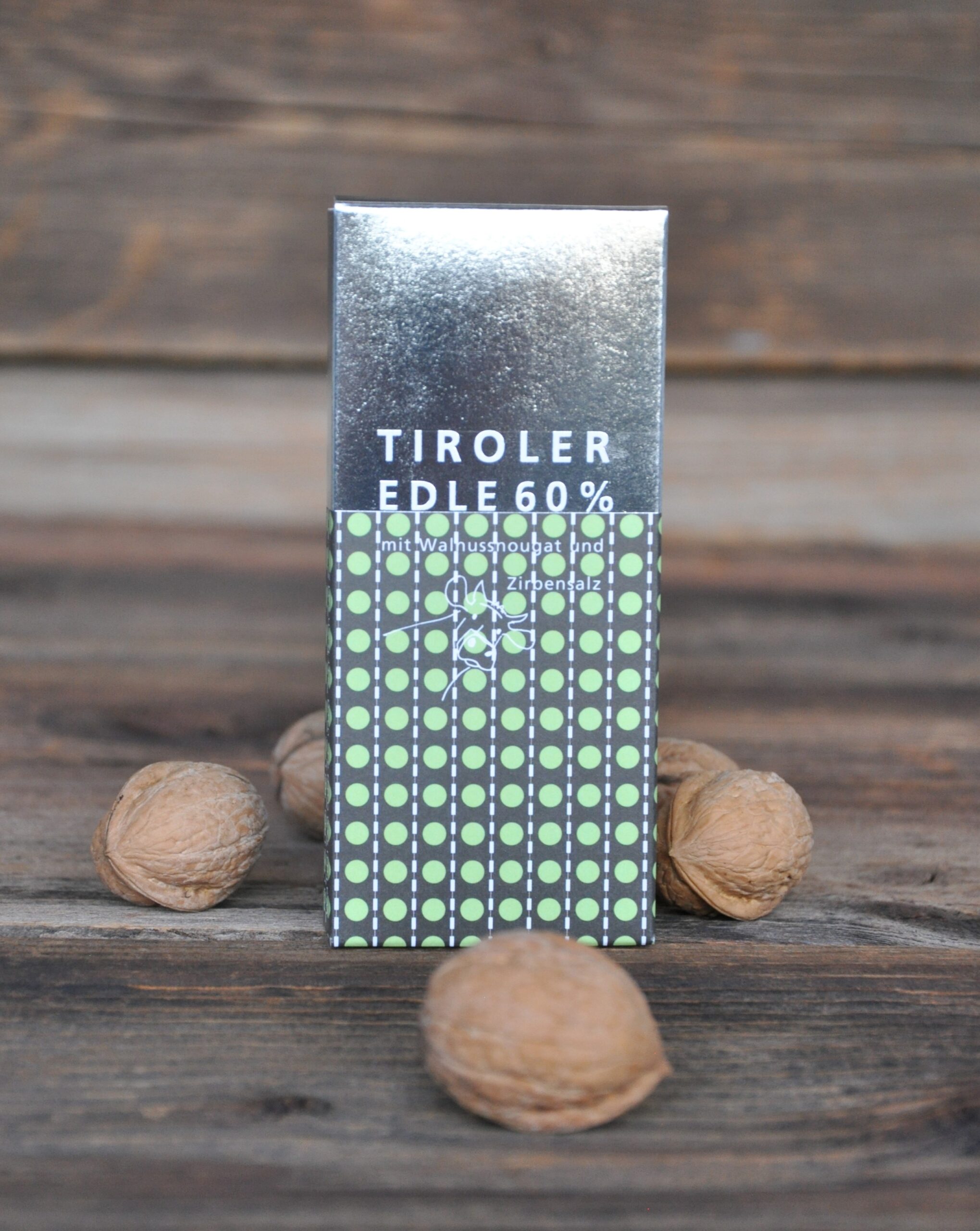 Die Hülle aus hochwertiger Edelbitter-Couverture wird mit feinem Nougat aus gerösteten Walnüssen gefüllt und mit Zirbensalz der Tiroler Salzsiederei “Essenz der Alpen” bestreut.